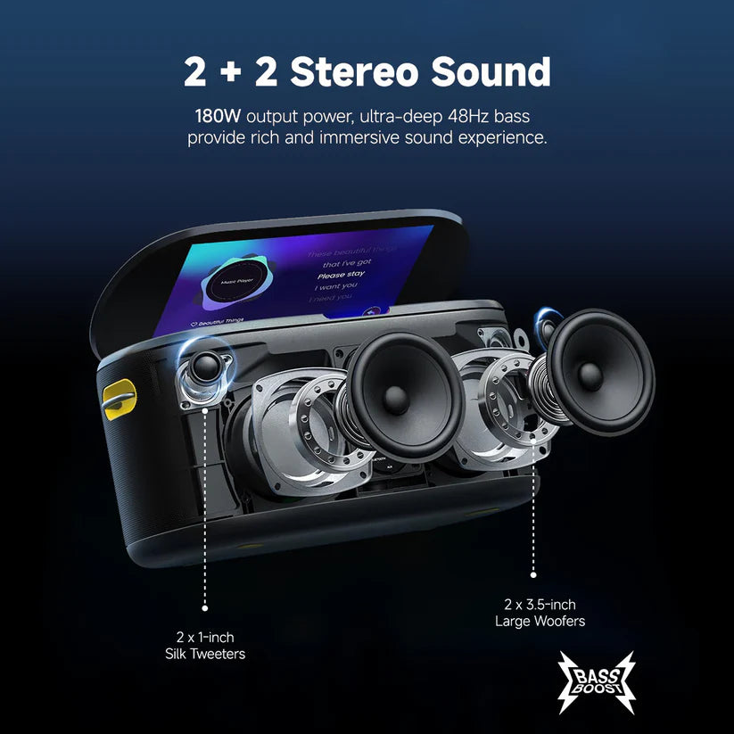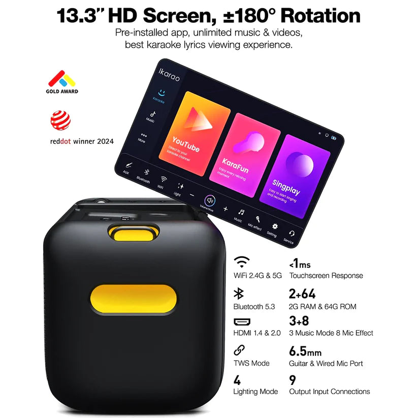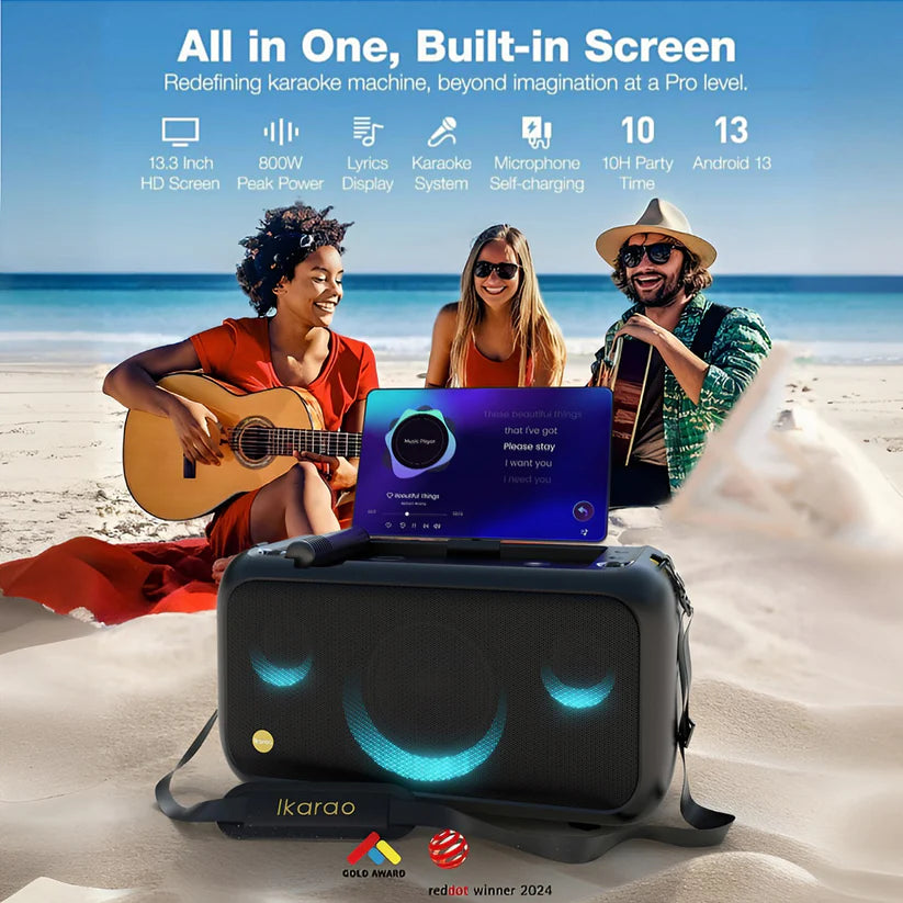 For bigger crowds and louder fun, the Ikarao Break X1 shines with 460W of peak power—its robust sound performance wows at any gathering, from family nights to friend get-togethers. It also includes built-in top-tier microphones and a larger 13.3" all-in-one tablet that lets you effortlessly navigate your favorite tracks. No more squinting at small screens—just scroll, select, and sing your heart out.